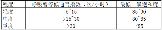 单纯根据多导生理记录仪睡眠呼吸监测结果可以将患者的病情分为正常(AHI<5)、轻度(AHI 5~15)、中度(AHI15~30)和重度(AHI>30)。夜间最低SpO₂作为参考。