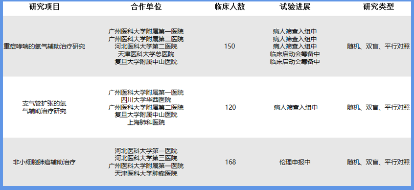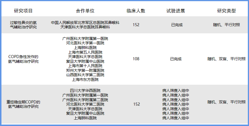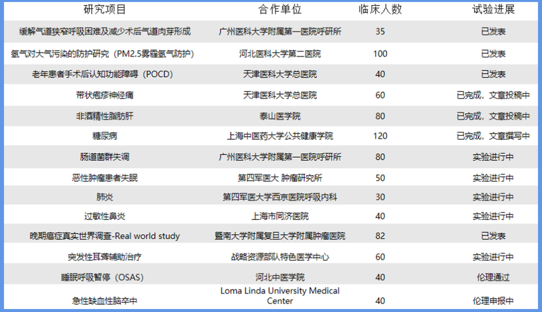 从2014年开始,我国百强三甲医院榜单中,大约有50多家医院携手潓美氢氧医学开展各类实验研究,合作医院包括国内顶尖的广州医科大学附属第一医院、复旦大学附属中山医院、北京协和医院、四川大学华西医院等,临床研究项目包括: