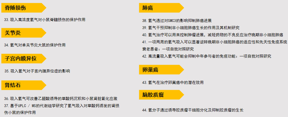 脊髓损伤、脑缺血再灌注损伤、哮喘、全脑缺血、小肠损伤、新生儿脑损伤、心肌缺血再灌注损伤、脊髓缺血再灌注损伤、肝缺血再灌注损伤、青光眼、心肌肥厚、多发性硬化、肾结石、芥子气中毒、视网膜炎、过敏性鼻炎、白内障、青光眼高眼压、葡萄膜炎、百草枯中毒、肿瘤体外研究、动脉粥样硬化、LPS肺损伤、肺纤维化、COPD、子宫内膜异位症、肺动脉高压、毒品成瘾、肺癌、抑郁症、睡眠呼吸障碍、有机磷中毒、爆炸性耳聋、突发性耳聋、尘肺、肺癌体外研究、噪声性耳聋、大肠癌、前列腺肥大、胰腺炎、脑卒中、脓毒症、间质性肺炎、放射性肺炎、脊髓ELENNS打击伤、血管性痴呆、急性肺损伤、帕金森症、慢性心衰、黑色素瘤、淋巴瘤、雾霾损害、心肌干细胞保护、骨质疏松、烧烫伤等。