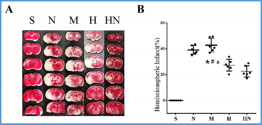 上图A是快速杀死大鼠后,提取大脑、切片、染色的结果,切片中白色部分即为脑梗死部分,白色面积越大代表脑梗死越严重,我们可以看出,H组和HN组脑梗死面积相对较小,甚至比非糖尿病MCAO组要小,其中,HN组脑梗死面积是最小,这说明:对于糖尿病脑卒中,吸氢氧比不吸氢氧好,夜晚吸氢氧比白天吸氢氧好。
