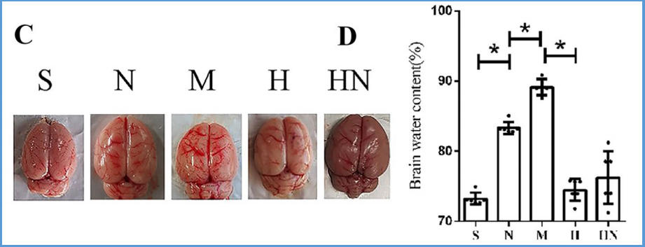 由图可知,糖尿病脑卒中会导致脑含水量的大幅增加,如N组、M组,而吸入氢氧混合气体可以减少大脑含水量,其中白天吸氢氧的H组效果更好,已经非常接近正常的S组大鼠的指标。