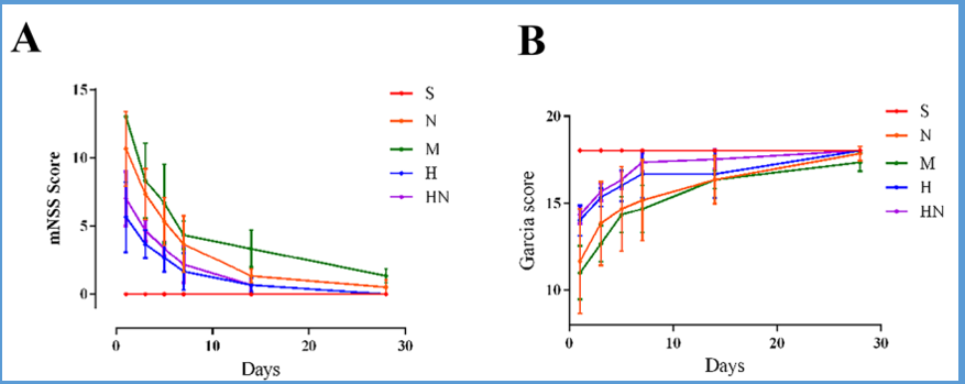 科学家分别测量了各组大鼠的mNSS评分,(mNSS评分即“改良神经损伤严重程度评分”分数越低,神经损伤越轻,分数越高神经损伤越严重。具体如大鼠能直线行走则记0分,如不能直线行走记1~3分)同时也测量了大鼠Garcia分数,分数越高,大鼠状态越好。总体结果如下:
