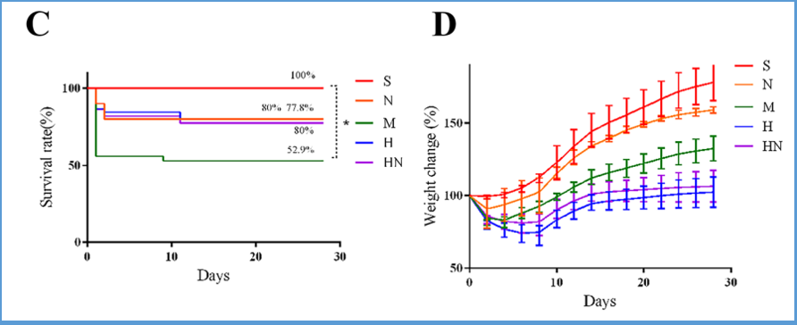 科学家分别测量了各组MCAO小鼠存活率及体重变化情况,如下: