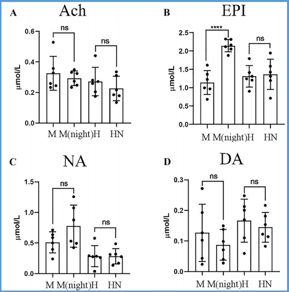 实验中测量了M组、M(night)组、H组、HN组各种神经递质的含量,对比白天、黑夜情况下,吸氢氧、不吸氢氧的区别。如下图: