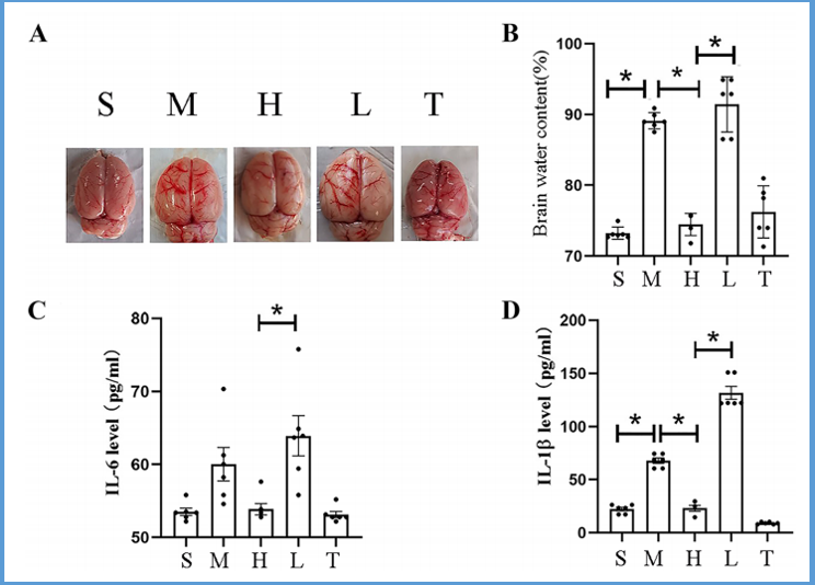 实验还测量了S、M、H、L、T各组的脑含水量及炎症因子IL-6、IL-1β水平,结果如下图所示: