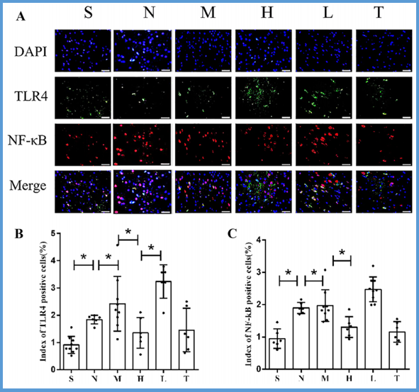 科学家提取大鼠大脑切片染色并放大400倍观察。显微镜下,TLR4显示为绿色、NF-κB为红色,细胞核为蓝色,结果如下: