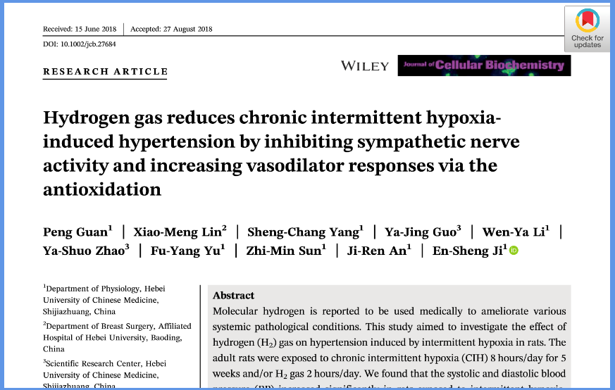 【1,2】Ji et al. Hydrogen gas reduces chronic intermittent hypoxia‐induced hypertension by inhibiting sympathetic nerve activity and increasing vasodilator responses via the antioxidation. H2可降低慢性间歇性低氧(由阻塞性睡眠呼吸暂停症所致)的高血压.Journal of Cellular Biochemistry. 2019 Mar;120(3):3998-4008;