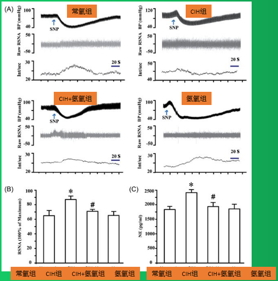 同时,氢氧吸入也抑制了CIH模型的RSNA,这个指标与高血压的发生密切相关(即“Renal sympathetic activity”,肾交感神经活性)。