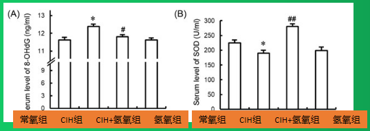 科学家测量了氢氧抗氧化的作用,具体在于氢氧吸入对于DNA氧化损伤的保护,以及血清中超氧化物歧化酶的(SuperoxideDismutase,即SOD)情况。其中DNA氧化损伤可以通过血清中8-OHdG(DNA损伤的标志物)来体现,抗氧化作用可以通过测量血清SOD来体现。(SOD越高说明抗氧化功能越强),结果如下: