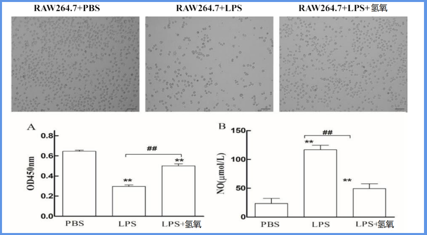 LPS组细胞增殖显著降低,NO含量显著增加,如下图中显微镜范围内,细胞密度说明了LPS组细胞数量最少,LPS+氢氧组显著增多。