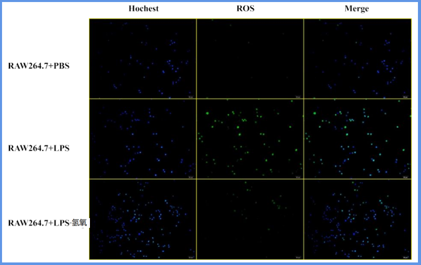无LPS刺激的PBS细胞状态良好,LPS组细胞状态恶化,ROS升高,LPS+氢氧干预后,ROS显著降低,如下图: