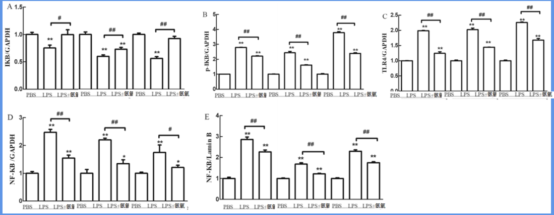 与对照组相比,LPS刺激后I-κB表达水平降低,而磷酸化I-κB、TLR4和NF-κB水平增加,通过氢氧吸入干预,则I-κB增加,磷酸化I-κB、TLR4和NF-κB降低。