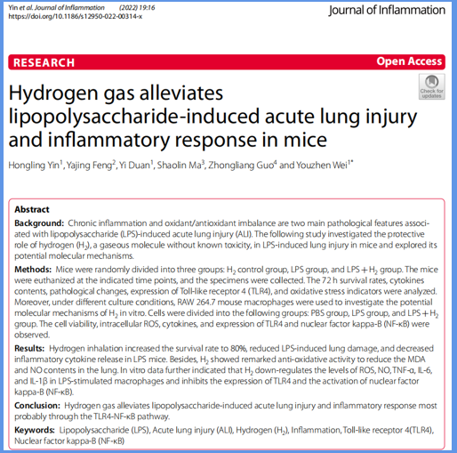 【4】Hongling Yin,Yajing Feng,Yi Duan,Shaolin Ma,Zhongliang Guo,Youzhen Wei1,Hydrogen gas alleviates lipopolysaccharide-induced acute lung injury and in"flammatory response in mice,Journal of Inflammation,(2022) 19:16