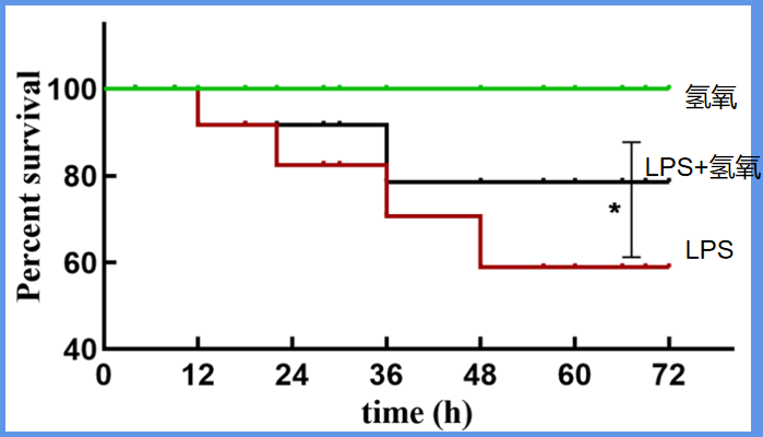 经过72小时观察, 3组模型存活率呈现较大差异,氢氧组存活率为100%,LPS存活率为60%,LPS+氢氧组存活率为80%。