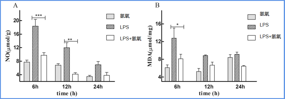 上文提到NO水平和MDA水平与氧化应激水平有关,上图可以看出,LPS组的NO水平和MDA水平都比较高,LPS+氢氧明显低于ALI组,证明了氢氧对LPS引发氧化应激的抑制作用。