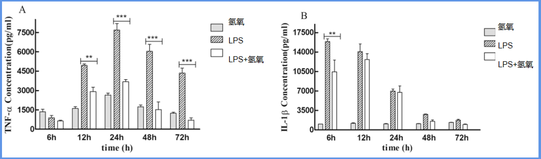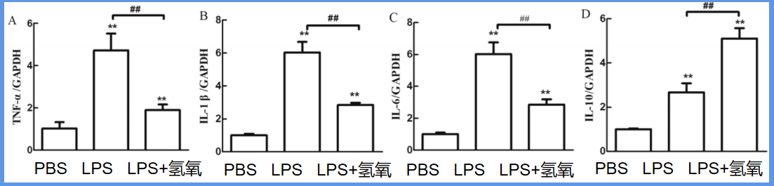 有LPS刺激的LPS组与没有LPS刺激的PBS组对比,四种细胞因子含量显著增加,同时TNF-α、IL-6、IL-1βmRNA水平均被氢氧抑制。这些研究表明氢氧可以中和LPS促炎介质作用。