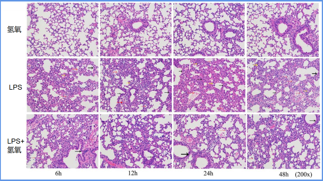 上图可以非常直观地看出氢氧对于LPS诱导病变的改善,第二行的LPS组有大量表示病变的颜色箭头,第三行吸入氢氧组仅剩下很少一部分。