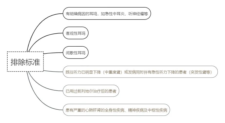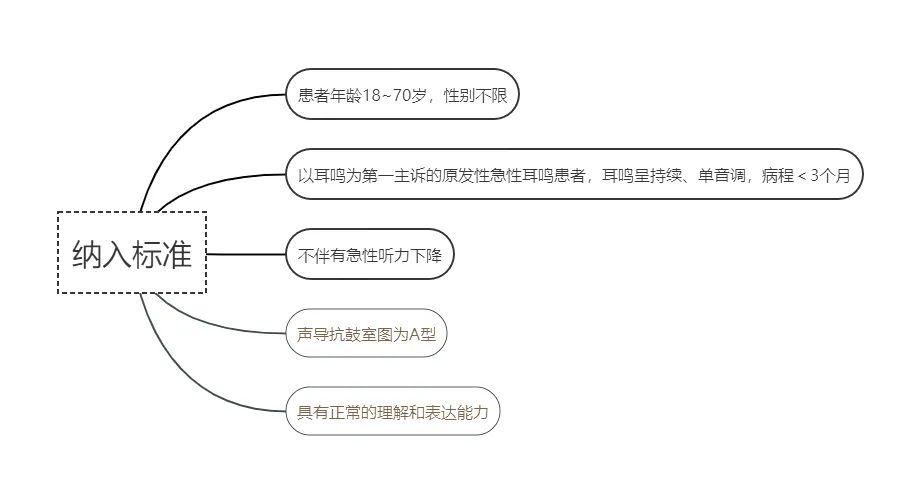 收集2019年5~12月来同济大学附属同济医院耳科专家门诊就诊的、以耳鸣为第一主诉的患者,进行相关的耳部检查、听力学测试(包括纯音测听、声阻抗及脑干听觉诱发电位)及影像学检查(内耳道CT或MRI),排除可能的器质性病因,按入选和排出标准筛选后,签署知情同意书方予以随机分组,进行治疗试验。