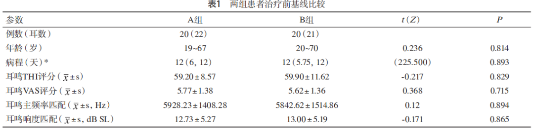 比较两组治疗前、治疗后的THI、响度VAS评分及耳鸣匹配值(音调及响度匹配)的变化:(以THI得分评估疗效等级,以(治愈+显效患者例数)/总例数来计算治疗的有效率。)
