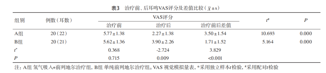 两组治疗后耳鸣VAS评分均较治疗前下降,A组治疗后下降的值较B组大,差异有显著性(P<0.05)(表3)