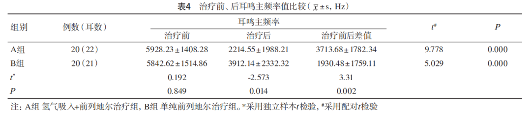两组治疗后耳鸣主频率均较治疗前下降,A组治疗后下降的值较B组大,差异有显著性(P<0.05)(表4)