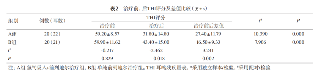 两组治疗后THI评分均较治疗前下降,A组治疗后下降的值较B组大,差异有显著性(P<0.05)(表2)