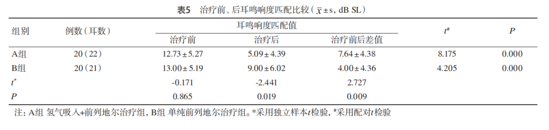 两组治疗后耳鸣响度匹配(dB SL)均较治疗前下降,A组治疗后下降的值较B组大,差异有显著性(P<0.05)(表5)