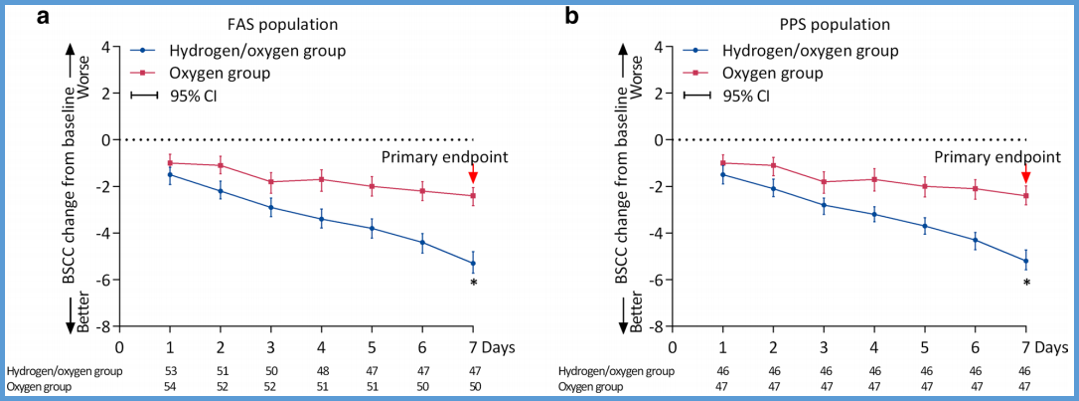 科学家进行的BCSS评分结果,证明了氢氧混合吸入疗法优于氧疗法。(BCSS:Breathlessness, Cough, and Sputum Scale,BCSS分数越高表示呼吸困难、咳嗽、咳痰越严重,下图蓝色为氢氧组,红色为氧气组)