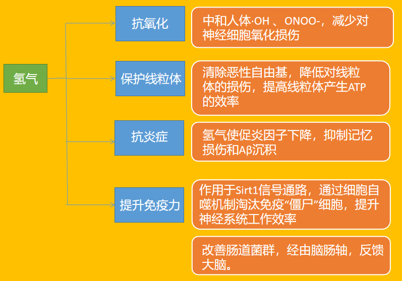 因此,氢气通过这条途径,帮助神经元细胞抗氧化、抗凋亡,在对抗阿兹海默症的过程中,起到意想不到的效果。