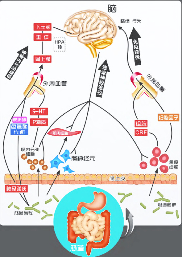 肠道菌群也会通过肠-脑轴影响大脑状态,如下图: