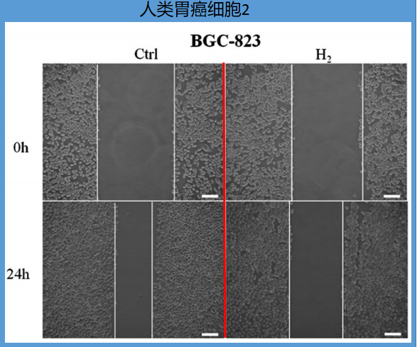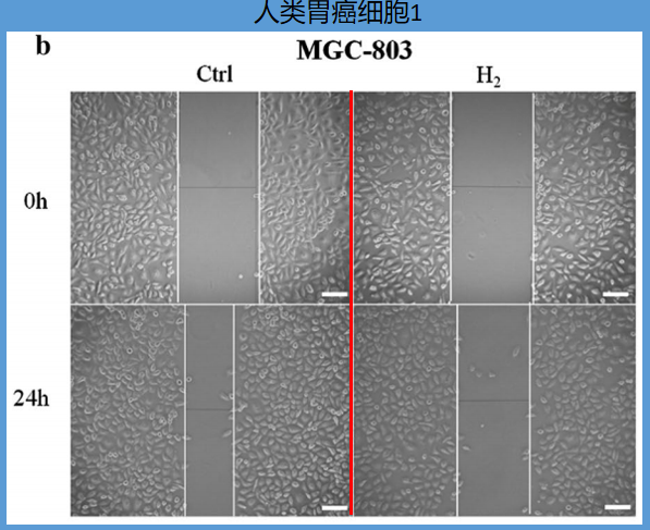 科学家用尖锐工具在充斥胃癌细胞的培养板上划痕,显微镜下,划痕处无胃癌细胞,划痕两侧依旧充斥胃癌细胞。继续培养24小时之后,观察对照组、氢气组两边胃癌细胞“侵占”划痕处的速率,以此来评判胃癌细胞的运动能力。