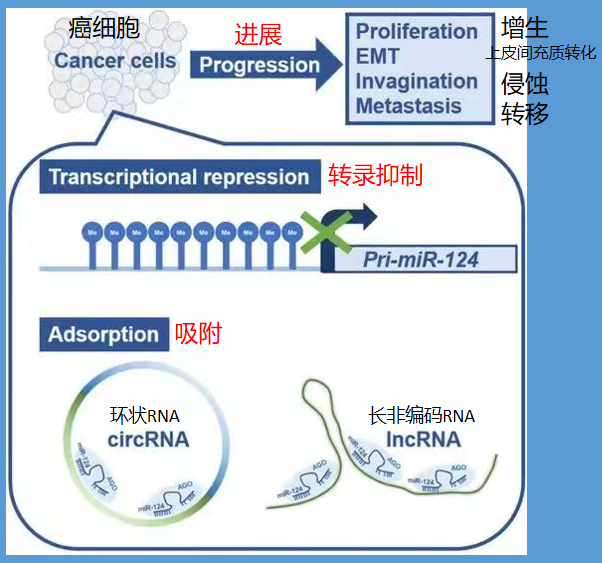 可以看到,miR-124可以“吸附”lncRNA,或可以抑制发挥生物学作用