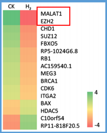 胃癌细胞对照组(CK)和氢气组(H2)基因组表达对比,抑制最明显的前两个基因分别是lncRNAMALAT1和EZH2。