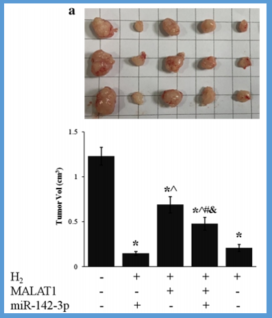 吸入H2可显著抑制人类胃癌细胞在小鼠身上移植的肿瘤生长情况(p<0.01,H2与。Ctrl)这与不同癌症的临床观察结果一致。lncRNA MALAT1的过度表达部分抑制H2的作用,而miR-124-3p抵消了lncR MALAT1的作用。而H2可以上调miR-124-3p,所以得到实验结果: