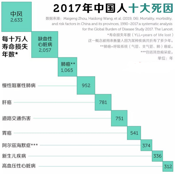 每年死于中风的中国人,比肝癌、胃癌等其他癌症加起来都多。除了癌症以外,我们还需要防范的有中风、心脏病、慢阻肺(COPD)、阿兹海默、高血压!