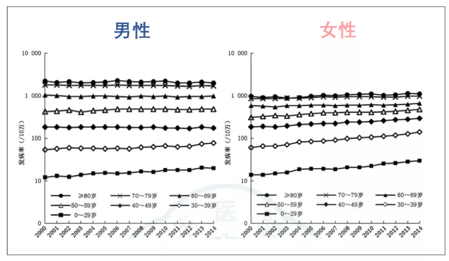 不过,中国的不少癌症,确实出现了年轻化的趋势。下面这张图,展示了中国 2000~2014 年各个年龄段癌症发病率情况。