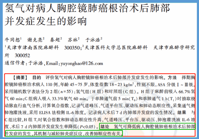 ①文章名称:《氢气对病人胸腔镜肺癌根治手术肺部并发症发生的影响》