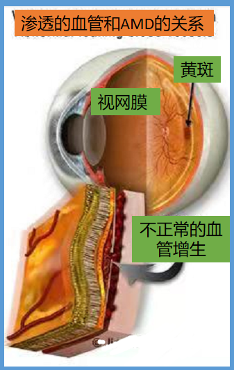 当干性AMD严重时,功能不良的间膜无法组织脉络膜的血管向视网膜增生,由于这种血管组织不良,难以阻挡血管中水液渗出,就会造成水肿,另外也无法组织脂肪蛋白质的渗出物,眼底出现湿润的水气变化,就进展为湿性AMD。