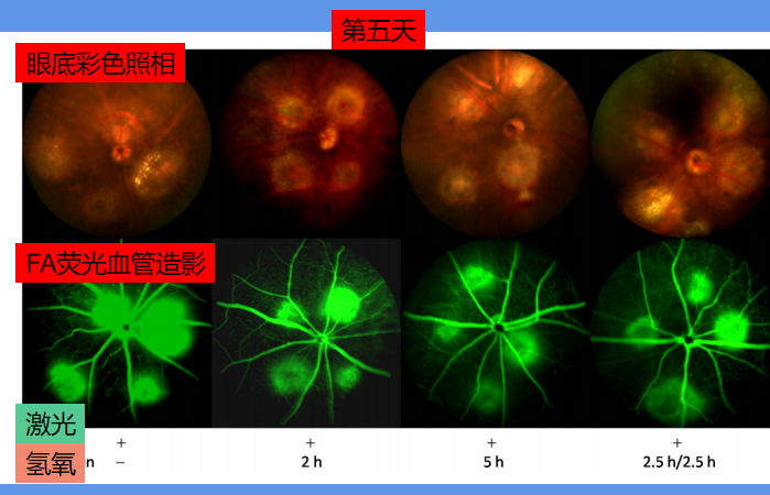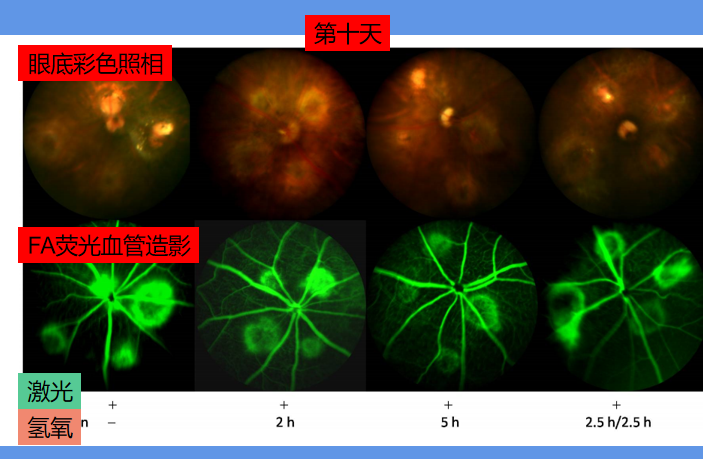 在实验开始第十天后(激光光凝后第五天),科学家再次进行眼底彩色照相和FA荧光血管造影,对比结果更加明显。