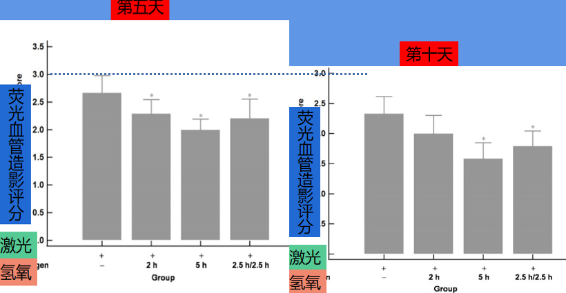 通过评分,可以得出结论。使用氢氧混合气组,CNV恢复效果好于单纯激光照射组。使用5h组和2.5h/2.5h组,要明显好于2h组,而使用5h组又要好于2.5h/2.5h组。