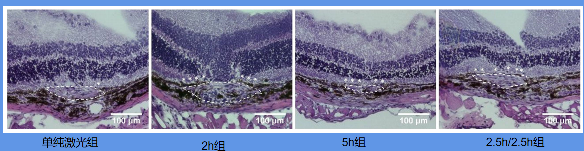 注意看图中白色虚先框出来的地方,这里就是CNV组织。该实验结果非常明显,连续使用5小时CNV组织明显变小很多!同时,CNV组织上的视网膜色素上皮覆盖率(标有星号的深色组织)也有所增加。
