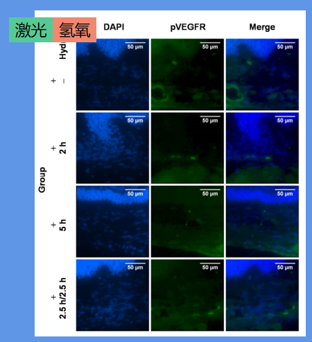 免疫荧光染色显示如下图。在氢氧吸入后,血管内皮生长因子受体(磷酸化血管内皮生长因子受体,pVEGFR)磷酸化降低。