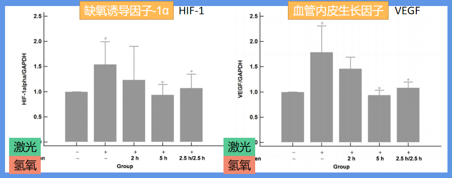 同时,我们也可以看到氢氧吸入有效下调缺氧诱导因子-1α和血管内皮生长因子的基因表达。与2小时组(每天2小时的较短吸入时间)相比,5小时组(每天5小时的较长吸入时间)的效果更显著。5小时组和2.5小时/2.5小时组的效果相似,这表明,在这两种基因的表达这个层面,间断吸入可以达到与连续吸入相似的效果。