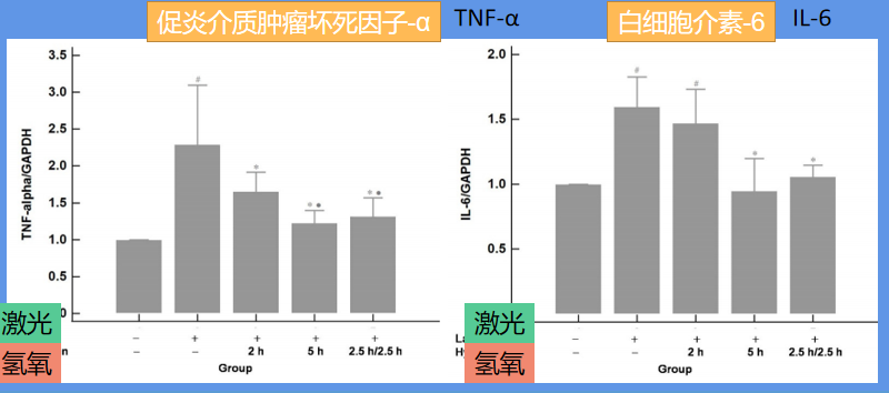 氢氧吸入已被证明可降低缺血/再灌注损伤或视网膜、肝脏和大脑中炎性细胞因子的水平,包括TNF-α、IL-1β和IL-6。在目前的实验中,氢氧混合吸入可以有效抑制肿瘤坏死因子-α和白细胞介素-6的基因表达。还发现了吸入时间依赖性效应。