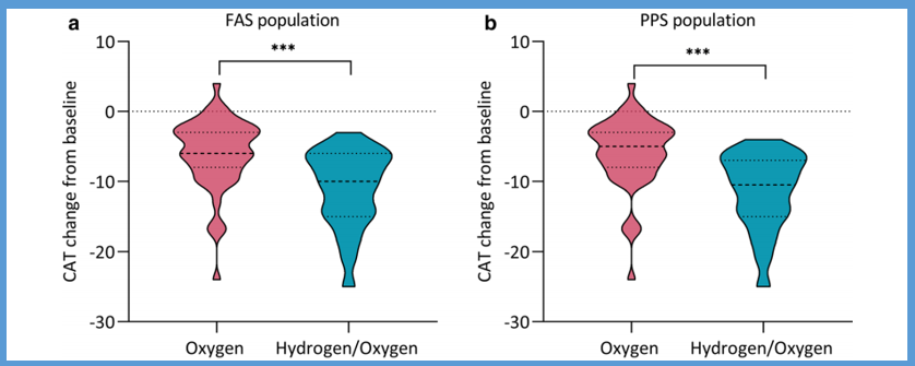 红色为氧疗法组,蓝色为氢氧吸入疗法组。图片纵向指标为CAT差值(低于0为改善,数值越小越好),横向宽度表示人数多少。