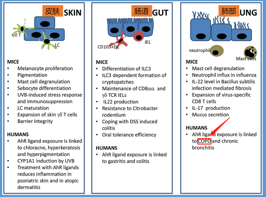 此外,AhR受体在各个表皮细胞皆有表达,包括肺的表皮细胞、肠胃道表皮细胞、皮肤的表皮细胞,如下图: