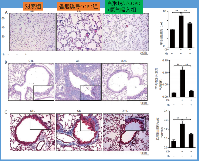 ④《氢气吸入可防止烟雾引起的小鼠COPD》一篇中,科学家同样使用香烟诱导COPD模型。并用氢气进行干预。结果显示,使用氢气组可以改善COPD模型的肺功能下降,减轻香烟诱导的气肿,以及小气道中的胶原蛋白沉积和杯状细胞肥大和气道上皮增生。