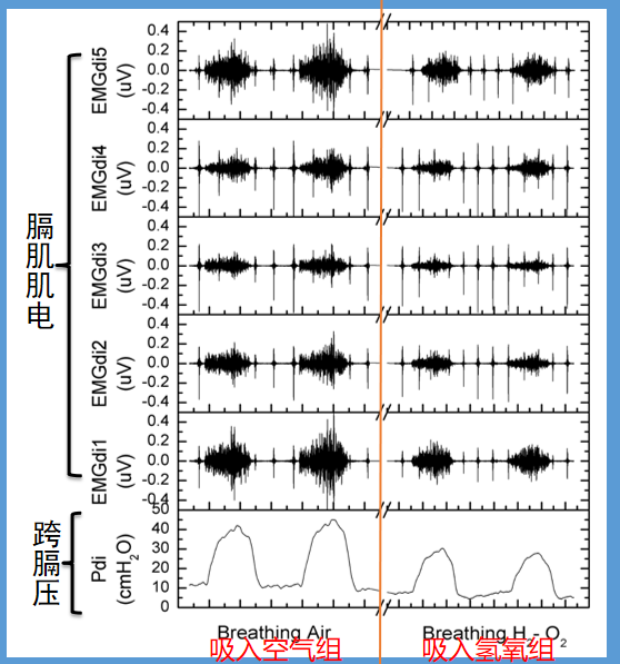 上图可知,吸入氢氧混合气体的患者,膈肌肌电和跨膈压明显比空气组小,这说明患者呼吸努力程度减小,换言之,呼吸更加顺畅。