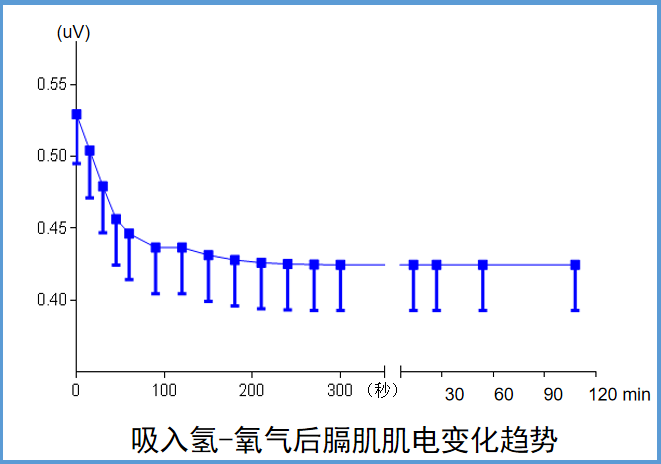 从时间上看,使用氢氧混合吸入之后,患者呼吸改善的速度非常快。100秒内,膈肌肌电就能看出较为明显的效果。如下图: