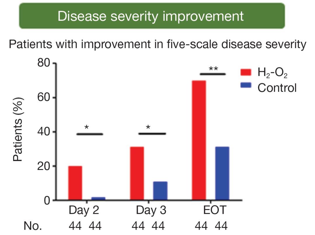 在治疗第二天、第三天···治疗最后一天,氢氧吸入组疾病严重程度改善率均好于氧气组。